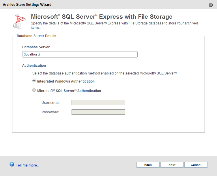 If you have opted to use a Microsoft® SQL Server, Microsoft® SQL Server with File Storage or SQL Server® Express with File Storage, the article helps you to set up a new Archive Store or to configure the existing settings.