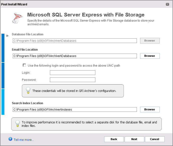 Instructs GFI Archiver to use the default paths configured within SQL Server®. Uncheck this option to set alternate paths.